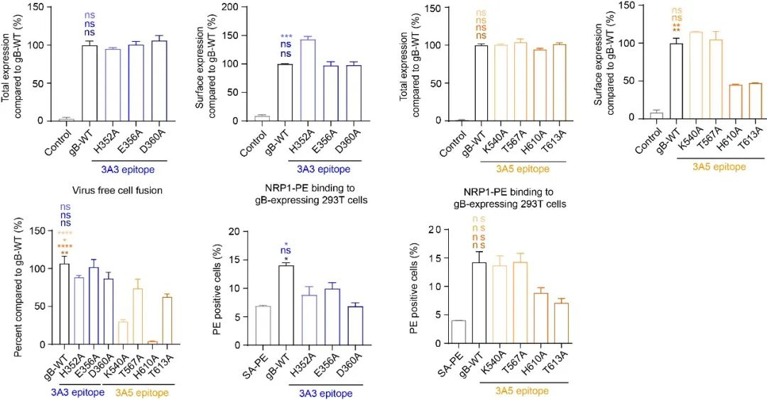 在细胞膜融合模型中,3A3关键位点突变蛋白不影响gB的膜融合功能,而3A5的关键位点突变均可抑制gB的膜融合功能,说明3A5所识别的表位对于gB在膜融合过程当中的变构至关重要,3A5可能通过阻碍gB变构而发挥中和功能。而3A3的表位与gB辅助受体NRP1的结合表位重叠,3A3所识别关键位点突变后,gB不能与NRP1结合,说明3A3可能通过阻断gB与受体的结合而发挥中和效果。