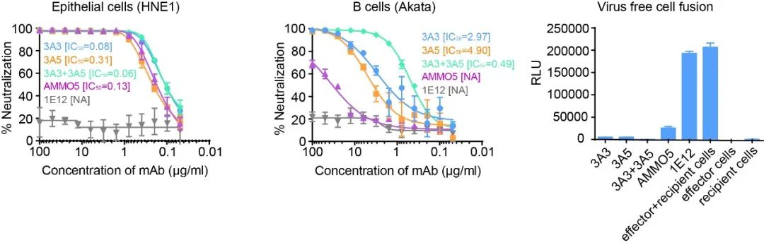 两株抗体均可有效中和上皮和B细胞感染,此外也能够有效抑制膜融合过程。另外,在细胞感染阻断模型中联合使用3A3和3A5显示出较强的协同效应。