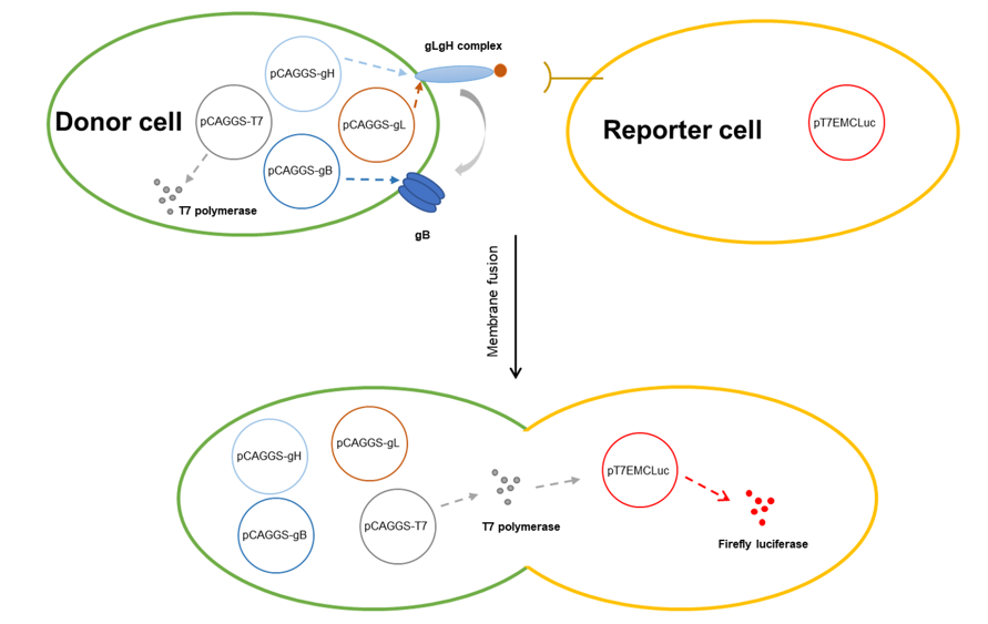效应细胞:HEK-293T达到80%汇合度时,转染2.5 μg pCAGGS-gB突变体、pCAGGS-gH、pCAGGS-gL和pCAGGS-T7(表达T7 DNA聚合酶)。受体细胞:HEK-293T细胞转染10 μg pT7EMCLuc(在T7启动子控制下表达荧光素酶报告基因)。转染24小时后,将2 × 105效应细胞与2 × 105受体细胞在24孔板中混合共培养24小时。按照Dual-Glo® Luciferase assay system (Promega)的说明,裂解共培养的细胞,定量荧光素酶活性。