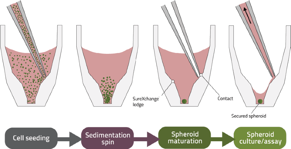 悬滴微孔板、磁悬浮微孔板和超低附着涂层球形微孔板等无支架技术在没有支架的情况下细胞自由生长,具有独特的优势。悬挂式滴板利用重力作用,通过自聚集形成球体。球体悬挂在开放的无底井中,这些井通常被封闭在平板的底部,以调节细胞的环境湿度。这种方法的优点是可以通过控制悬滴而精准的控制微组织球,使其具有高一致性,为后续研究提供好的微组织材料。而且通过悬滴法可以实现对不同细胞类型的共培养,保证共培养细胞间的信息交流。