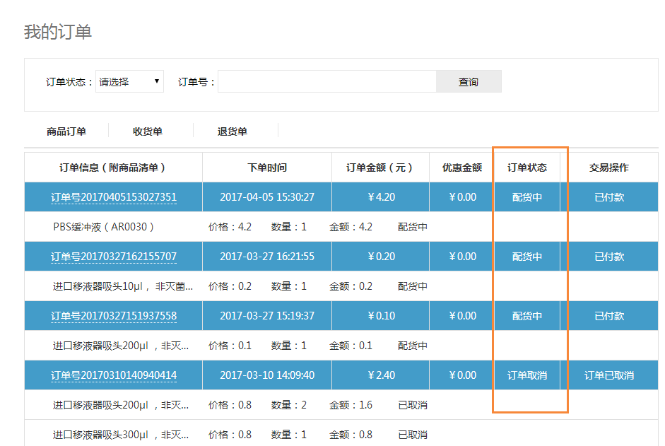 配货中:目前订单在等待库房人员出库,现货当日可以完成配货。期货则需要等货物到货后才能完成配货。